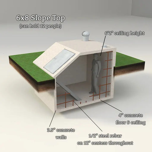 Home Defend ProMedium Slope Front Concrete Tornado / Storm Shelter - 6'x8'x6'2" This is our medium sized slope front unit. It holds 6 to 8 people comfortably. It...